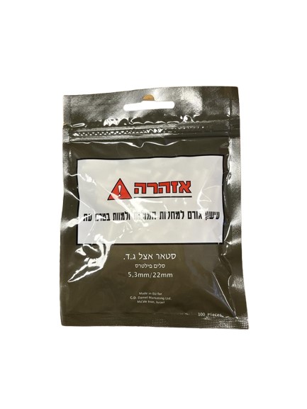 פילטר קוטר 5.3 מ"מ אורך 22 מ"מ פילטר מספוג לגלגול סיגריות. מגיע באריזת זיפ  100 פילטרים באריזה. הפילטר עטוף בנייר על מנת למנוע מעבר של צבע הניקוטין לאצבעות. בנוסף, לאורך הפילטר פסים מקווקווים דקים למניעת החלקה של הנייר בזמן הגלגול.